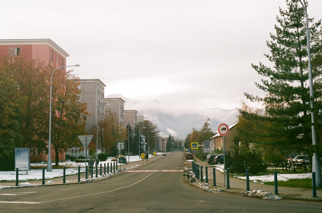 street in Liptovsky Mikulas with mountains in background
